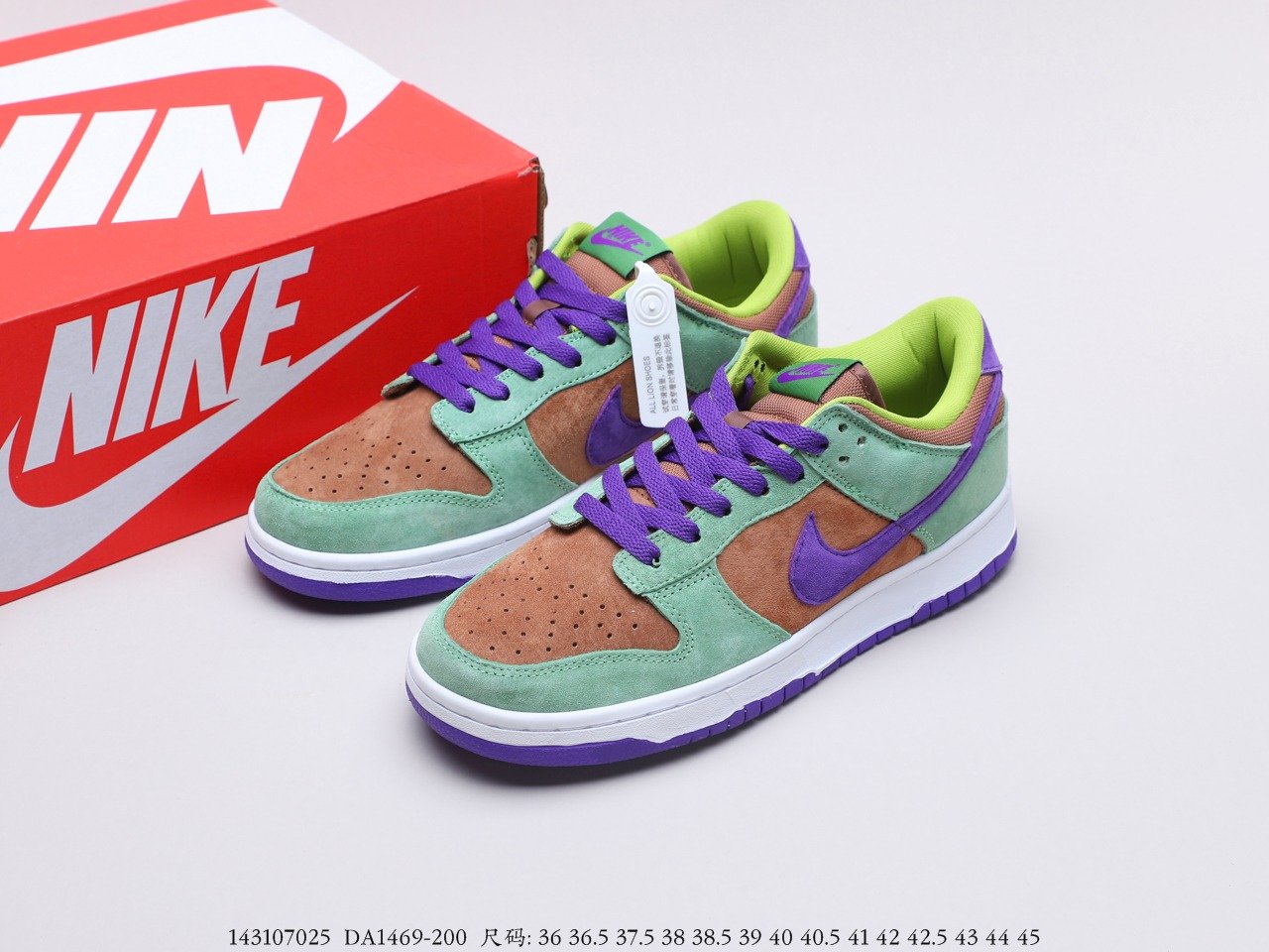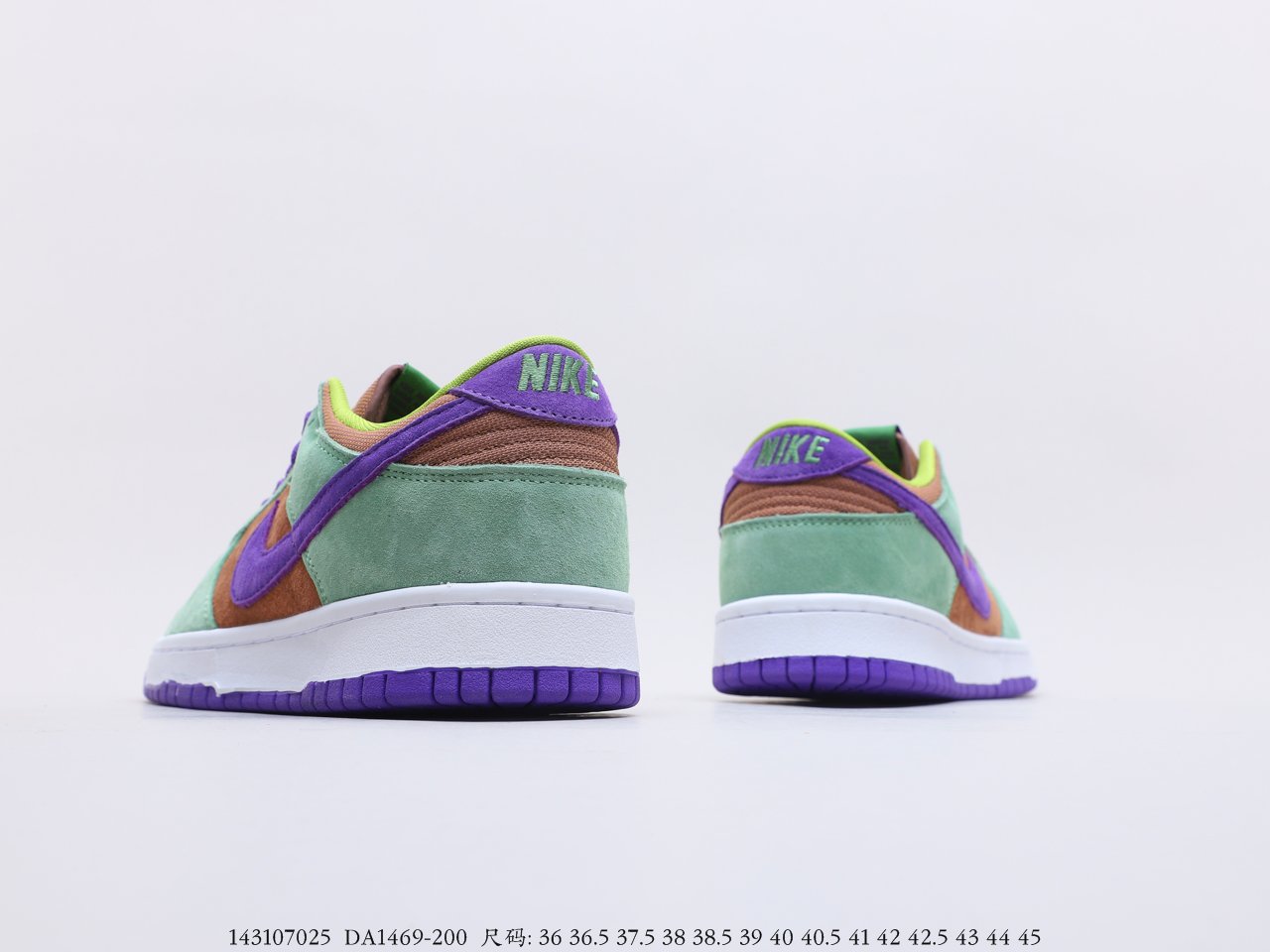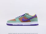 Nike Dunk Low SP “Veneer” Ugly Duckling SB low-top fashion casual sneakers are made of delicate suede leather, with a low-saturation light green frame, a brown upper and tongue, and a purple Swoosh Logo and shoelaces. The green and purple tongue label and fluorescent green lining are also very good, durable and highly recognizable. It is a new product with a high sense of fashion and appearance.