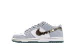 Nike Sean Cliver x Nike SB Dunk Low Pro QS White, Blue and Gold Blue Valentine’s Day Frozen Winter Valentine’s Day. Judging from the insole pattern, the new model is Christmas-themed. The upper is made of white leather and heart blue suede, with a metallic gold Swoosh and a silver-gray heel. The tongue label is embroidered with the word “CLIVER”, with silver laces, velvet lining and sequined outsole.